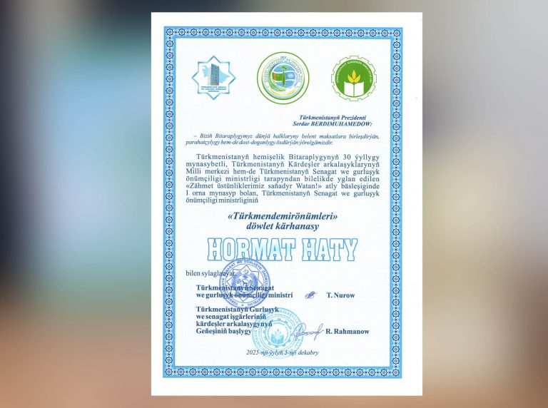 5-nji dekabrda Türkmenistanyň hemişelik Bitaraplygynyň 30 ýyllygy mynasybetli, Türkmenistanyň Kärdeşler arkalaşyklarynyň Milli merkeziniň hem-de Türkmenistanyň Senagat we gurluşyk önümçiligi ministrliginiň bilelikde yglan eden «Zähmet Dowam et »